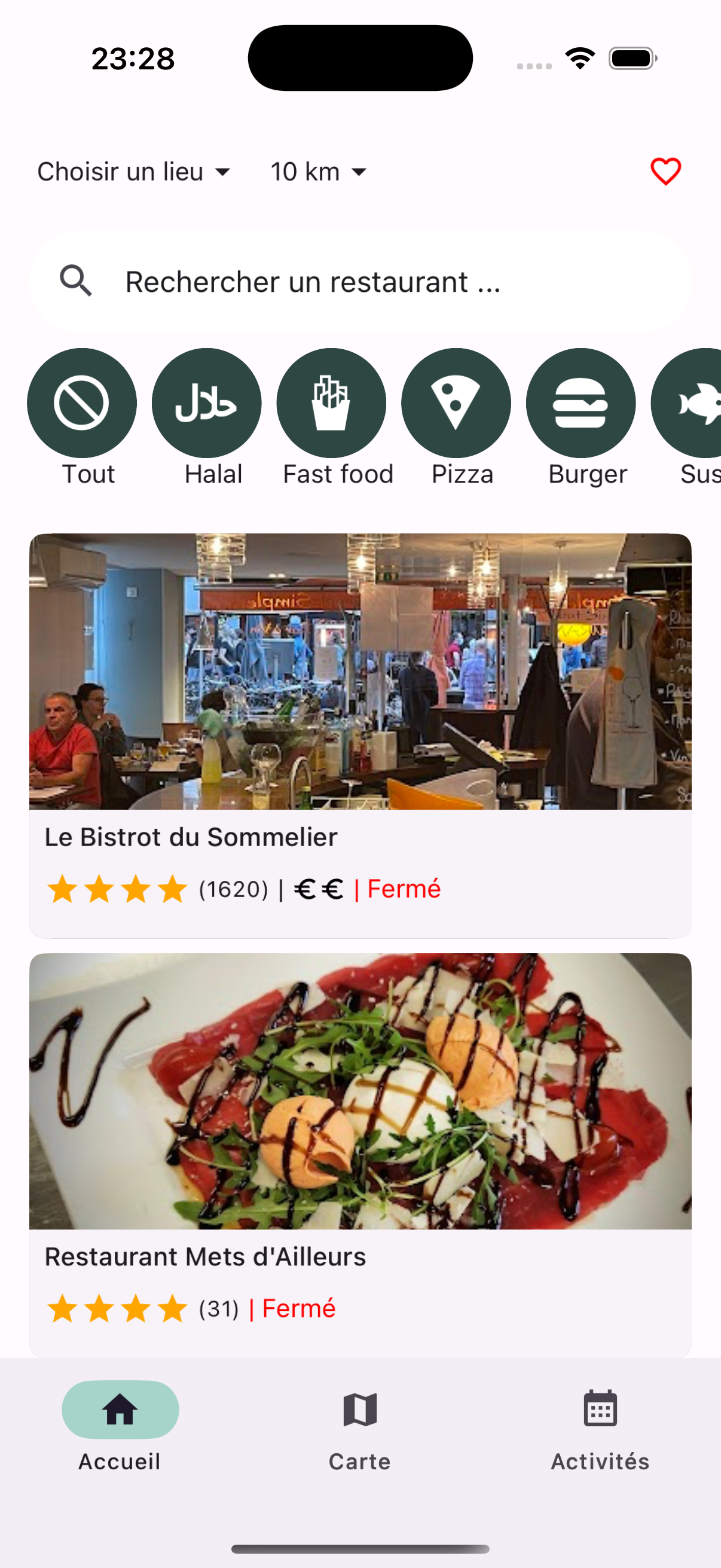 Application de découverte locale conçue pour trouver rapidement restaurants et activités autour de soi.
