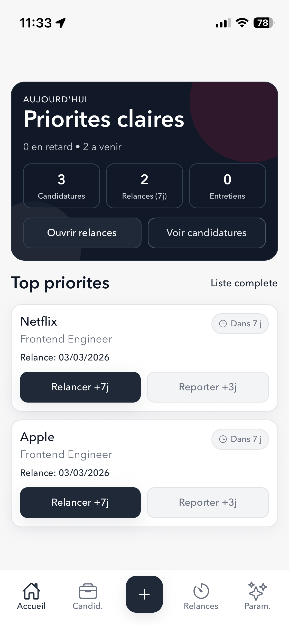 Application mobile qui centralise les candidatures, suit les étapes du processus et aide à prioriser les relances.