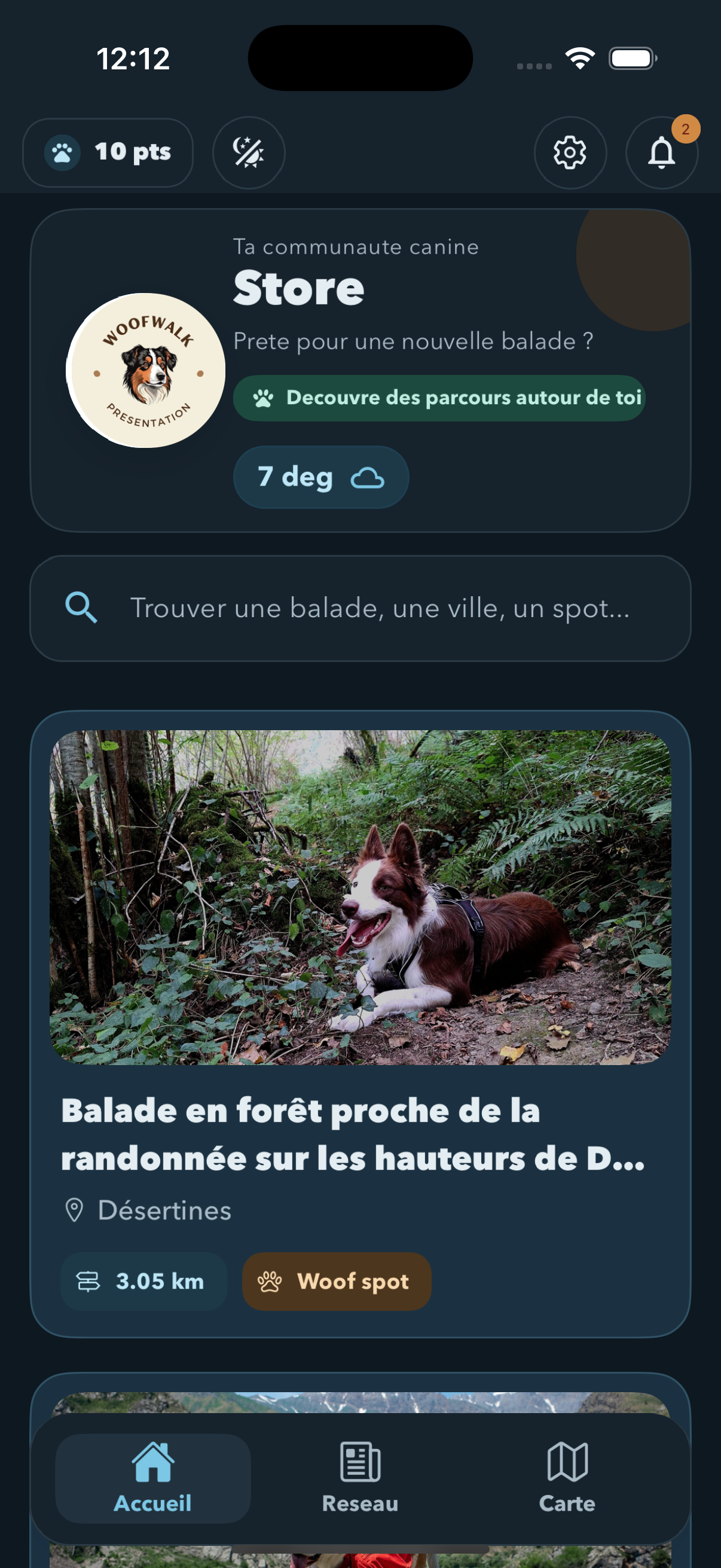 Application mobile qui réunit la communauté canine: découvre des balades dog-friendly, partage tes spots préférés et trouve facilement hébergements et restaurants adaptés à ton chien.
